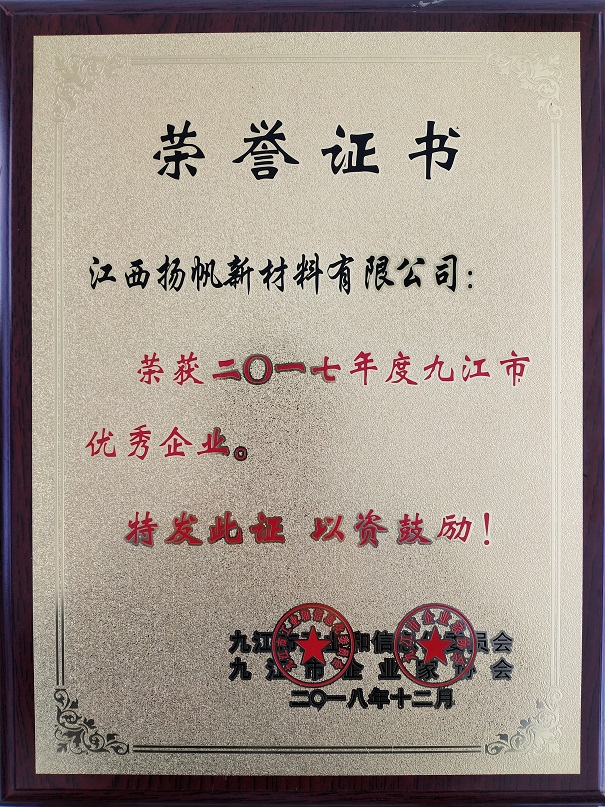12月14日,從九江市工業(yè)和信息化委員會(huì)以及九江市企業(yè)家協(xié)會(huì)聯(lián)合主辦的“2018年度九江市企業(yè)家協(xié)會(huì)年會(huì)及頒獎(jiǎng)大會(huì)”傳來(lái)喜訊,江西揚(yáng)帆新材公司獲評(píng)2017年度“九江市優(yōu)秀企業(yè)獎(jiǎng)”、2017年度 “九江工業(yè)企業(yè)第22名”。
