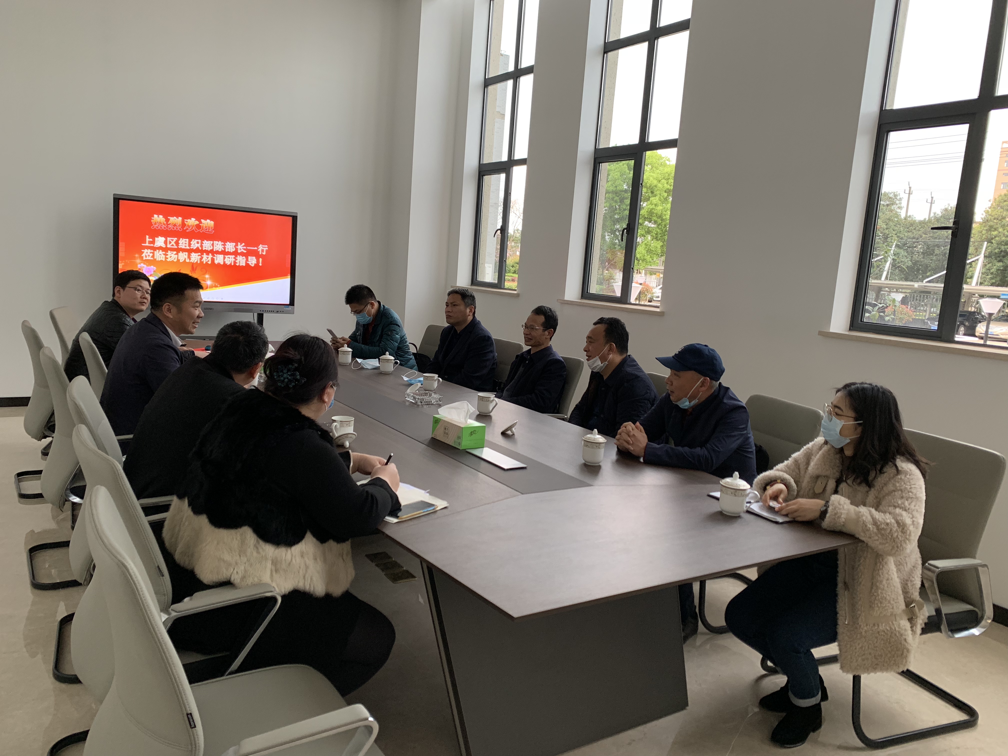 4月2日下午,上虞區(qū)委組織部常務(wù)副部長(zhǎng)陳學(xué)軍一行蒞臨揚(yáng)帆新材上虞生產(chǎn)基地就第三批“五星雙強(qiáng)”創(chuàng)建工作進(jìn)行調(diào)研指導(dǎo),區(qū)委組織部?jī)尚曼h建科、區(qū)“五星”系列創(chuàng)建工作專班辦、杭州灣綜管辦相關(guān)人員一同參加。揚(yáng)帆新材副總裁劉輝、上虞基地黨支部書記樊相徐等陪同調(diào)研。