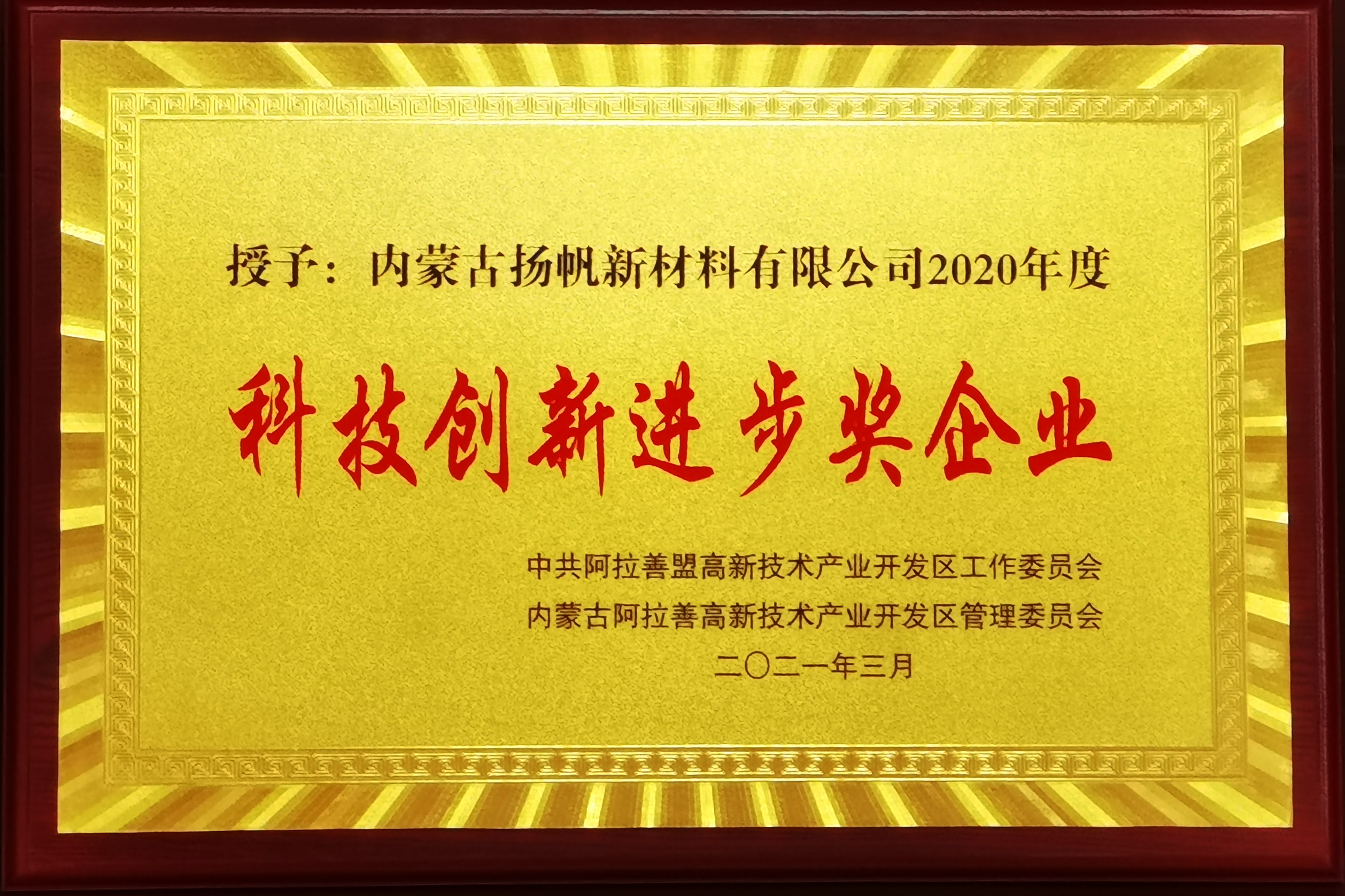 3月9日,阿拉善高新技術開發區召開“2021年度高新區、示范區黨的建設工作會議”,通報表彰了高新區、示范區在疫情防控和為地方經濟社會發展做出貢獻的先進集體和先進個人。內蒙古揚帆新材料有限公司榮獲“2020年度科技創新進步獎企業”,公司總經理劉輝獲“2020年度優秀企業家”榮譽稱號。