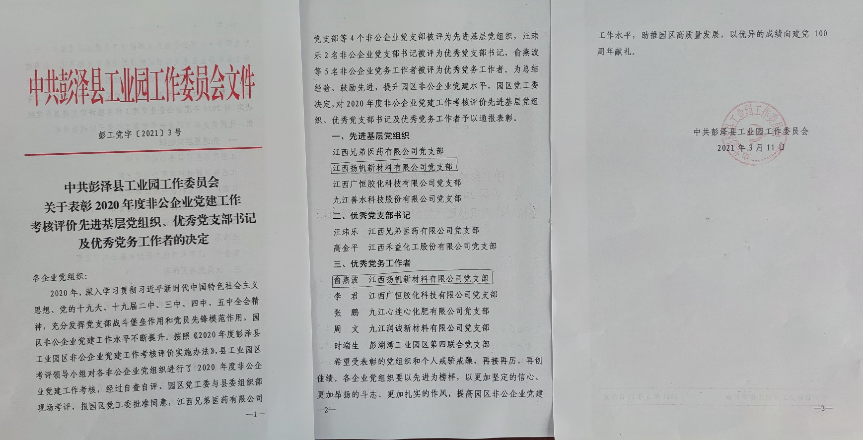3月11日,園區(qū)召開(kāi)2020年度非公企業(yè)黨建述職暨2021年非公黨建工作部署會(huì),會(huì)上表彰了2020年度非公企業(yè)先進(jìn)基層黨組織、優(yōu)秀支部書(shū)記、優(yōu)秀黨務(wù)工作者,我公司支部榮獲2020年度先進(jìn)基層黨組織榮譽(yù)稱號(hào),園區(qū)僅4家企業(yè)支部獲此榮譽(yù),同時(shí)支部俞燕波同志被評(píng)為優(yōu)秀黨務(wù)工作者。