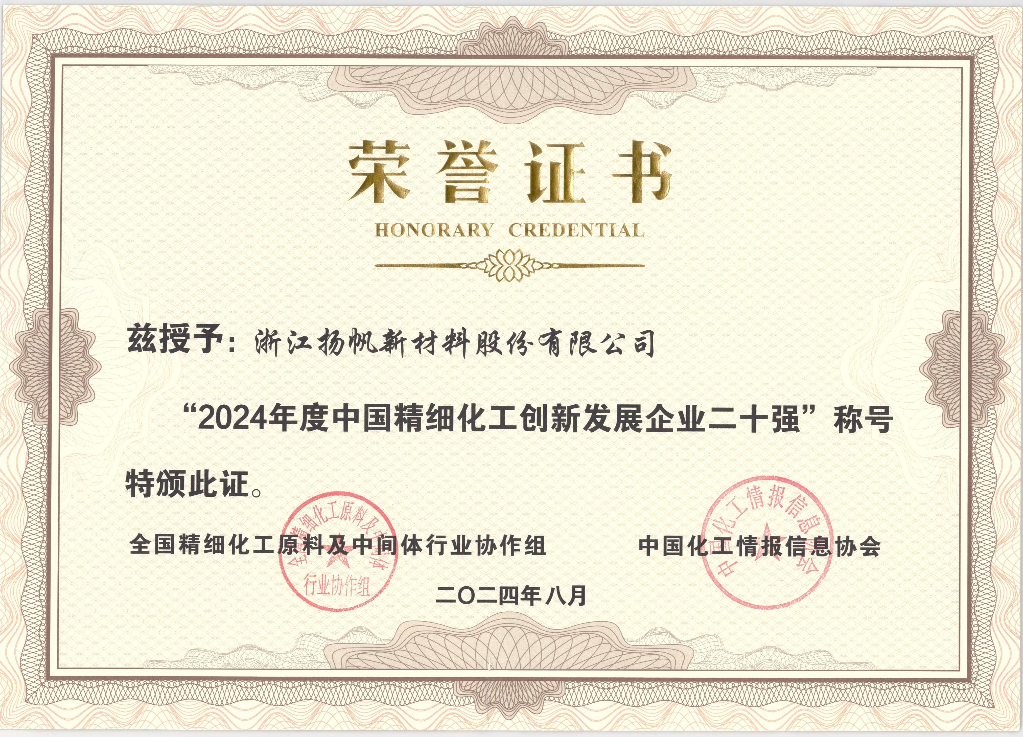 此外,公司榮登“2024年度中國(guó)精細(xì)化工創(chuàng)新發(fā)展企業(yè)二十強(qiáng)”,位居17位。