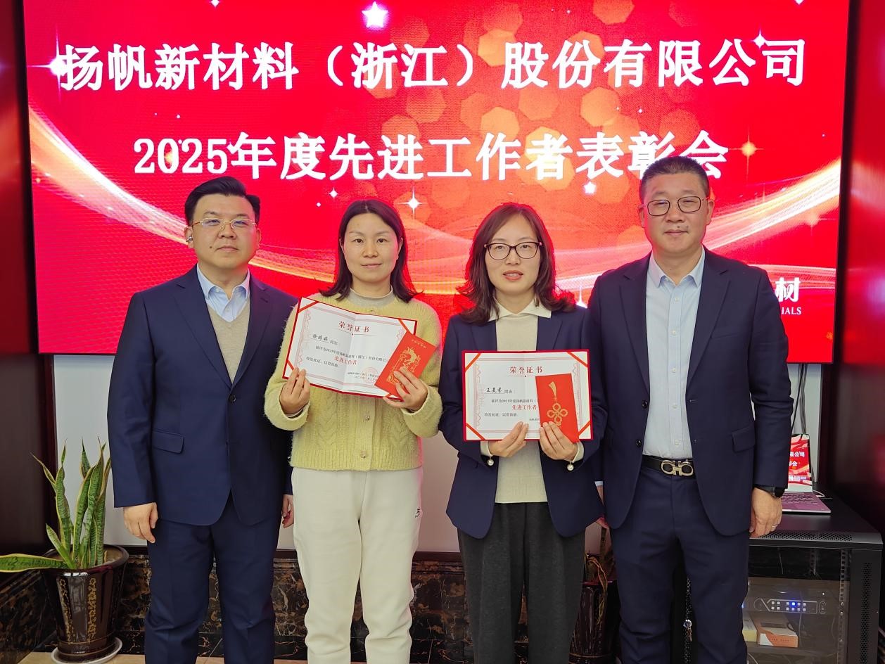 2025年企業取得優異業績離不開優秀員工的貢獻。樊彬董事長和陶明總裁在會上為銷售部副總經理王美芬和經理徐婷婷頒發2025年度先進工作者榮譽,希望他們2026年繼續努力,使銷售額再創新高。