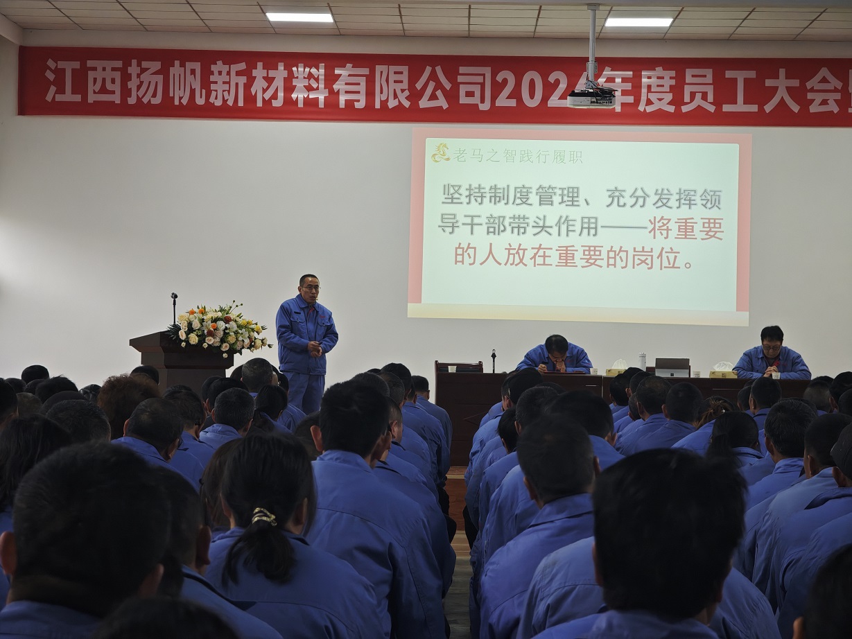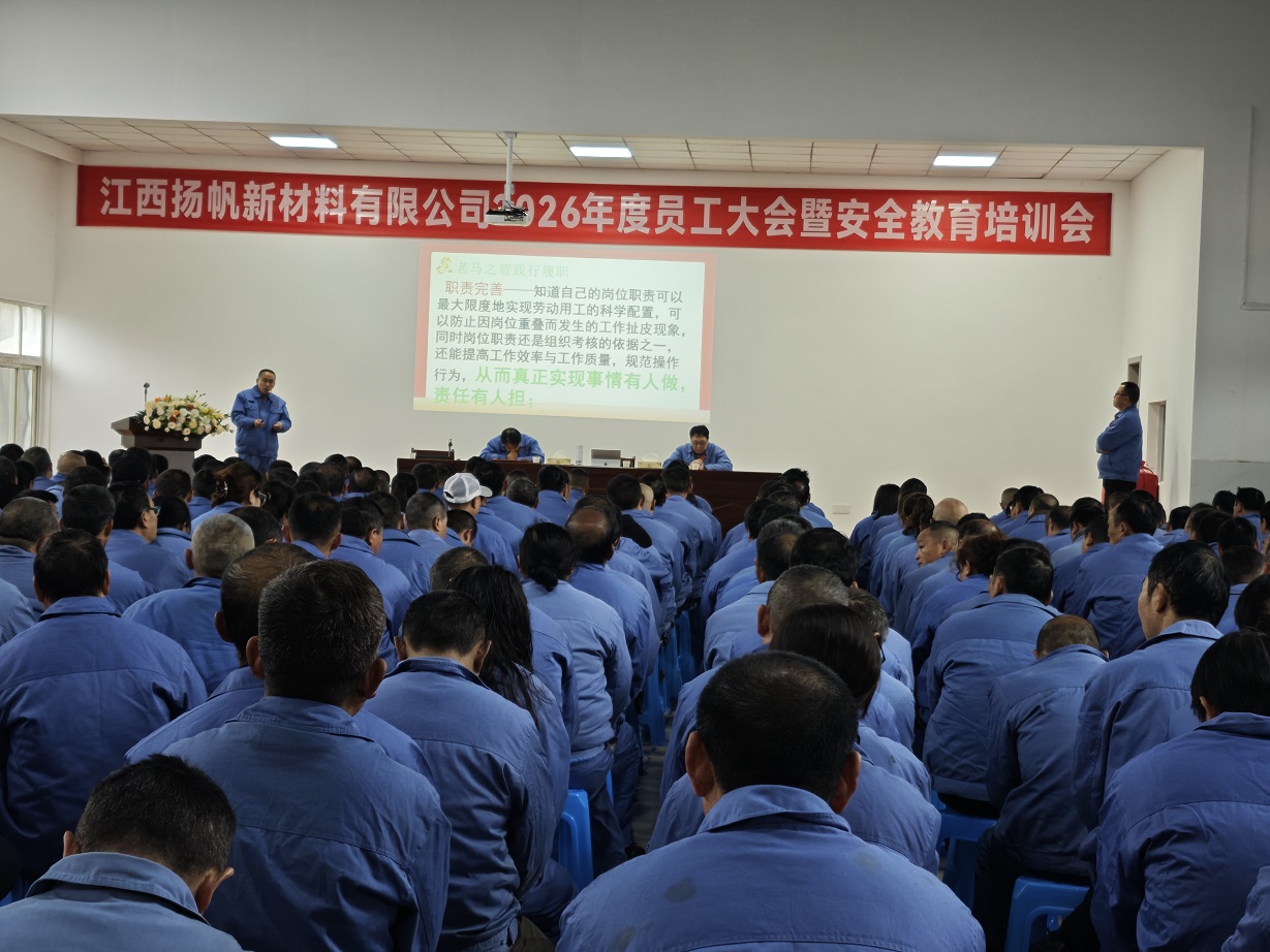 龍馬啟新程,聚力向未來。2月24日,江西揚(yáng)帆新材料有限公司2026年度員工大會(huì)暨安全教育培訓(xùn)會(huì)圓滿召開,全體員工齊聚一堂,總結(jié)過往發(fā)展成果、表彰先進(jìn)模范典型、部署新年工作目標(biāo)、筑牢安全生產(chǎn)防線,為新一年公司高質(zhì)量發(fā)展凝聚同心奮進(jìn)的磅礴力量。本次會(huì)議由公司副總經(jīng)理呂雪皓主持。
